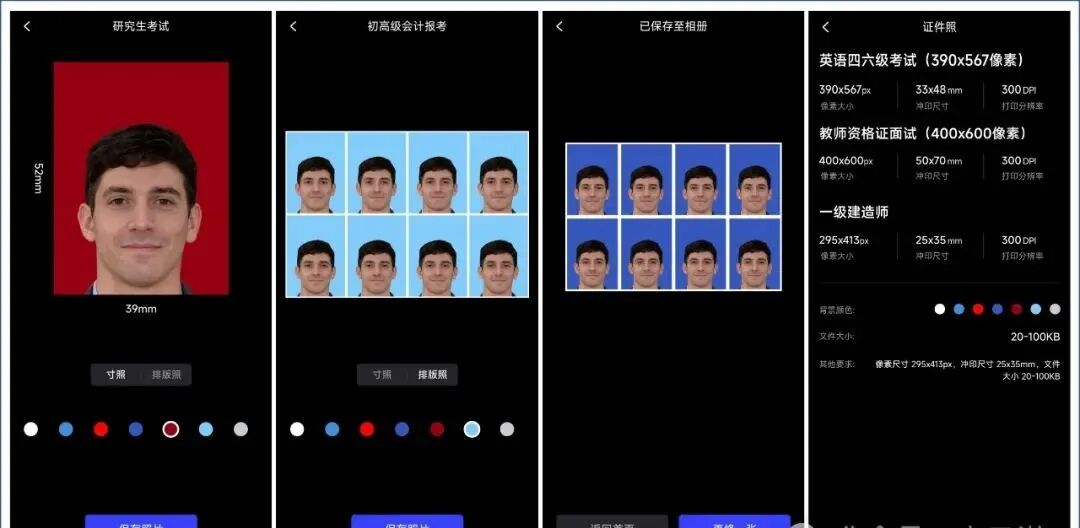 它只需要 3 步,就可以完成证件照制作,支持自动抠图和智能换底色,支持 7 种背景颜色任意切换,支持一键保存下载制作好的证件照和排版照。