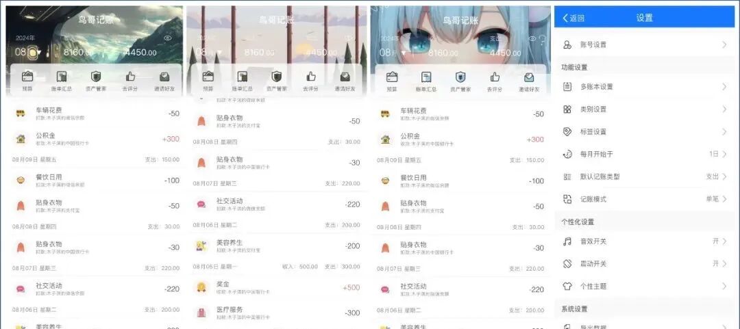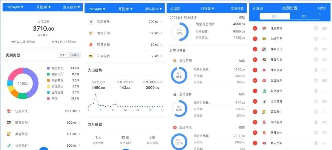 其中预算设置支持设置每个月的总预算和每个类别月预算,支持展示剩余百分比和剩余月预算。
