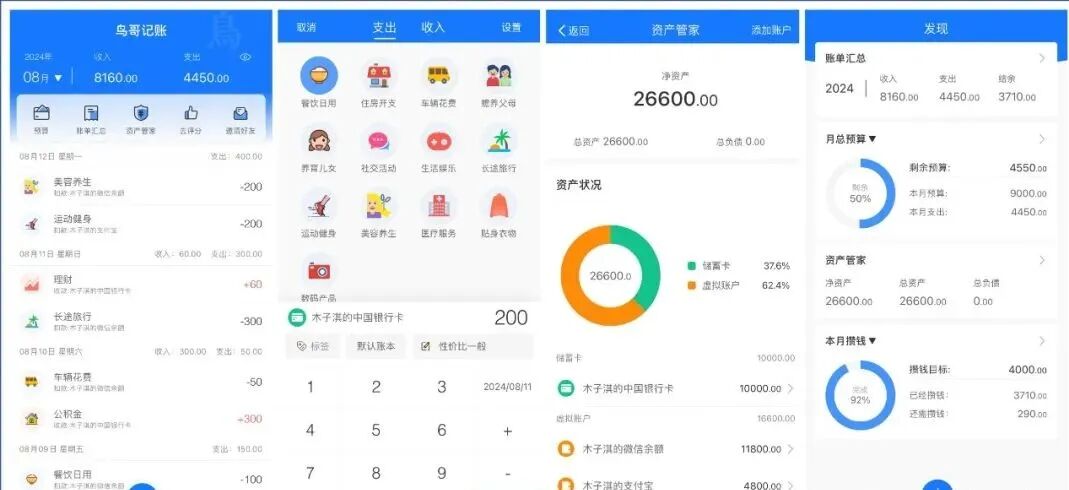 攒钱计划支持添加计划,包括:开始结束时间、攒钱金额、计划名称;账单明细支持按照时间顺序展示所有支出和收入,记账功能支持选择账本、账户、添加备注、选择时间。